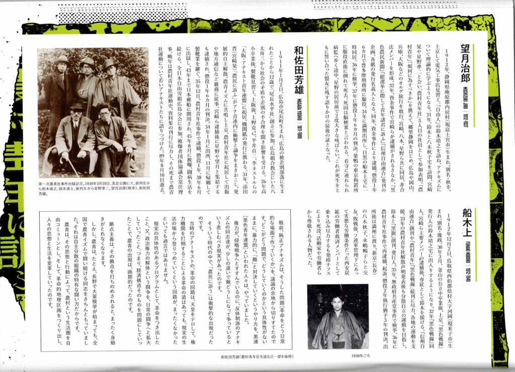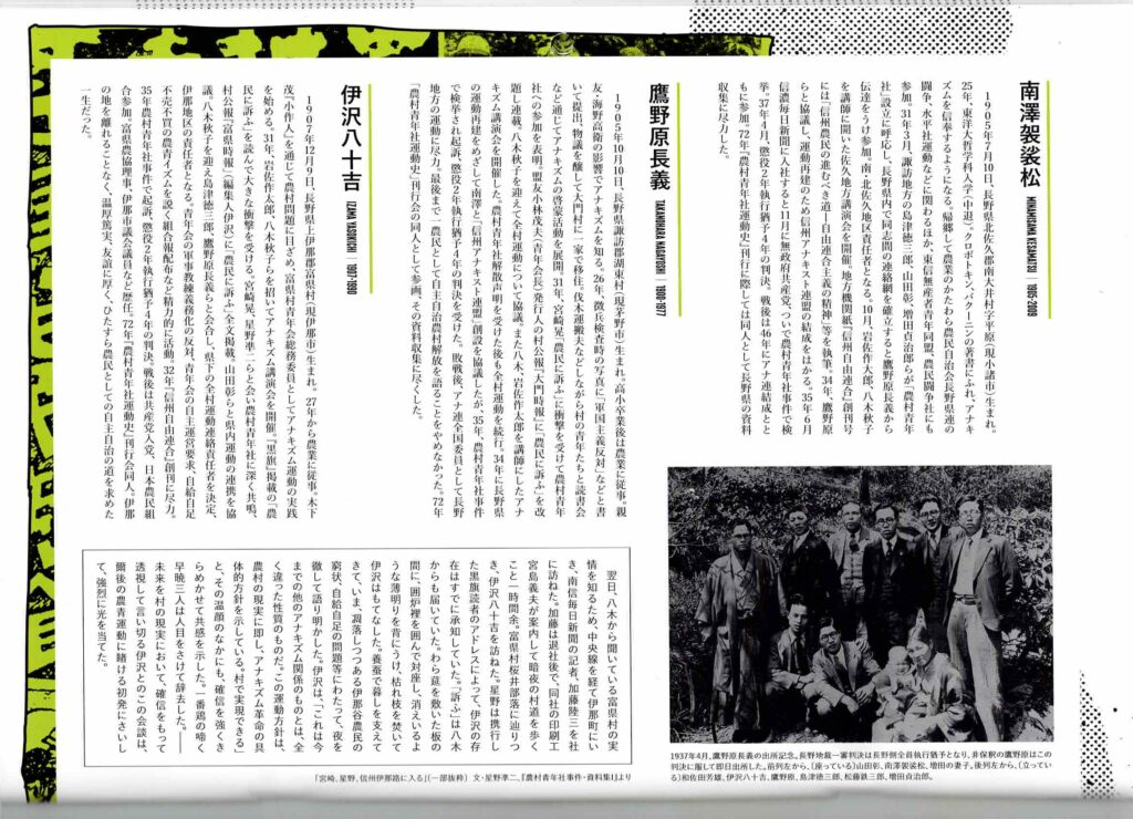 このカレンダーの「幾つもの写真」と引用された「コメント」は「農村青年社」活動の歴史をコンパクトにまとめたものとなっています。7月号については、農村青年社の出版物を当時住んでいた群馬県伊勢崎(群馬縣佐波郡名和村和田)の地で受け、戦時下を保存し続けていた大島英三郎さん。8月号はソビエト軍が襲来した1945年8月、満州で消息が不明だった船木上について、労働者や活動家から尊敬された事実が判明したことに少し触れます。また、9月号は信州において活動したメンバーの中から、佐久の南澤袈裟松さんの無二の親友だった鷹野原長義さんについて、その風貌から想起した思い出をまとめます。
